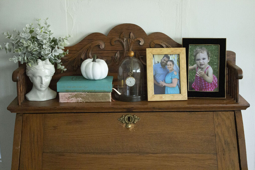 You can use your small pumpkins to jazz up a bookcase or shelf. In this case, I propped mine on top of a stack of books on my secretary desk. It’s the perfect way to add a touch of fall to your shelf styling!
